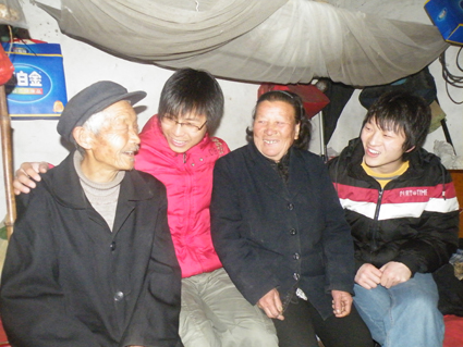 图:大学生蔡玉荣、付民与王德根夫妇开心聊天。