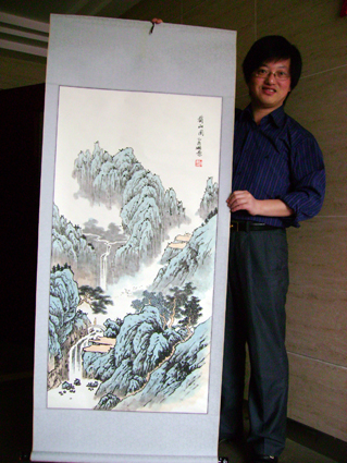 图:李先生展示他所捐拍的国家一级美术师温湘愚的山水画《看山图》。