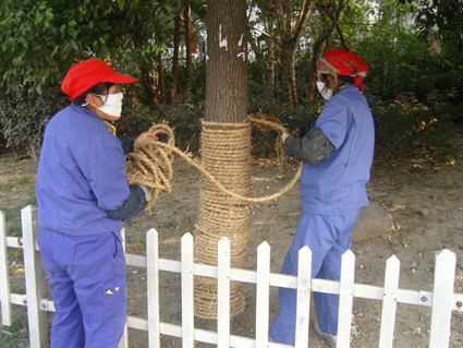 近日,一些细心的市民会发现,淮南城市道路两边的树木,都逐步“穿”上冬装。据园林部门介绍:冬季即将来临,为预防冬雪可能对城市树木造成的损害,所以给树木适时地增减“衣服”,保证它们顺利过冬。