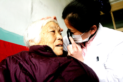1月13日,淮南东方集团肿瘤医院眼科医护人员与当地志愿者一起来到九龙岗镇敬老院,为孤寡老人义务进行眼疾检查,受到老人们的欢迎。