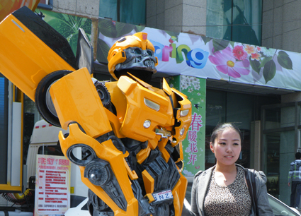 好莱坞大片“变形金刚”中忠诚、可爱、酷酷的机器人“大黄蜂”始终是“变形金刚”迷们喜爱的核心人物。据悉,这次“大黄蜂”来到淮南,是某品牌车展专门请来的特殊嘉宾,它全身“钢甲”依据原型比例打造,真人穿戴,高约2米的它缓慢地走在人群中,引来市民围观。