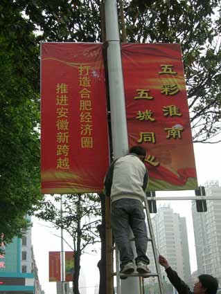 合肥经济圈城市党政领导第二次会商会议将于5月17日、18日在淮南召开,为营造浓烈的喜庆氛围,喜迎这次会商会议,淮南市市容局在全市主要干道两侧都挂上了“打造合肥经济圈 推进安徽新跨越”、“五彩淮南 五城同心”的喜庆灯旗杆。