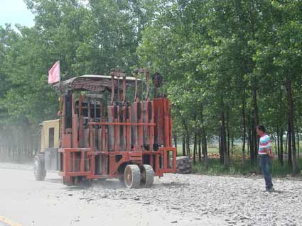 在淮潘公路施工现场,记者看到,一辆巨大的施工车辆低吼着缓慢行驶着,车辆尾部安装有十个巨大的铁锤,铁锤缓慢升起,然后重重地砸在路面上,这十个大铁锤就这样反反复复、起起落落,车辆缓慢行进,驶过的道路便是一片混凝土碎块。记者数了一下,在施工现场忙碌的这种机器,一共有3台。