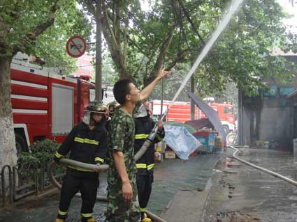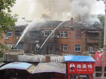 记者在现场看到七八辆消防车在不停地向楼顶喷水,但火势依然凶猛,不时能看见明火不断地蹿上房顶,大火沿2号楼的东头向西头蔓延,4户楼顶的居民家中都燃起了大火。为了控制火势,消防官兵兵分三路,一路从楼的正面用高压水炮向楼顶喷水,一路在2号楼的东头向失火房间注水,另外一路爬上楼顶将房顶破碎以阻断火势的蔓延。经过一个多小时的奋力扑救,火势基本上得到控制。