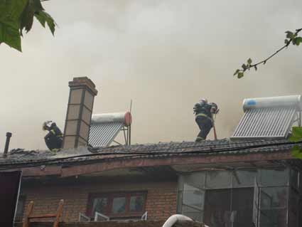 图三:消防官兵爬上楼顶将屋脊破碎阻断大火。