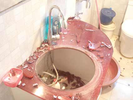 据苏女士称,前一天下午3点多钟,她和老公在楼下干活,就听“砰”的一声响,当时苏女士觉得可能是后面楼房收废品的在扔东西,也就没在意,可没过多久,她就听见其妹妹呼喊着跑下来说她家卫生间的洗脸盆炸了。苏女士连忙上楼,看到满屋的凌乱,到处的玻璃碎片。而最让苏女士感到后怕的是,10分钟前,她才把1岁多的儿子从卫生间送到卧室,如果迟个几分钟,后果不堪设想。