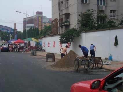 为了让田家庵区百花园社区的居民出行更加方便,市公路局组织施工人员改造小区内原有的坑坑洼洼的水泥路,铺上了崭新的柏油马路,居民们纷纷赞扬政府为百姓办实事。为了尽快完工,7月6日早晨,记者看到几名工人正冒着小雨抓紧铺设人行道上的盖板,看到工人如此辛苦,路过的居民很是感动。