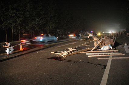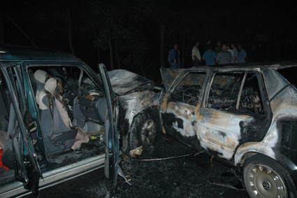 记者现场看到,一辆拖拉机倒在公路东侧,两个前轮被撞飞,公路西侧路边约20米处,停着一辆越野车和一辆轿车,轿车已全部烧毁,越野车前半部被撞毁,里面也有部分被烧毁。一位目击者说,车祸发生后,轿车上的人员刚被路人救下车,轿车就着了火。