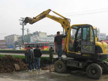 接到王先生的反映后,记者立即前往现场进行查看。当天上午12时许,记者来到泉山十字路口时看到,在洞山西路北侧机动车辅道上,距十字路口约20米的地方,一台挖掘机和数名工作人员正在作业。现场已挖掘出一个一米多深、直径约1.5米的大坑,一名工作人员正在坑内忙碌着,在坑旁边已堆起了很多挖起的泥土。而从大坑所在位置边上的绿化带起,记者看到机动车道上留有大片的水渍,向西延伸了数百米。