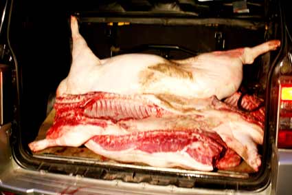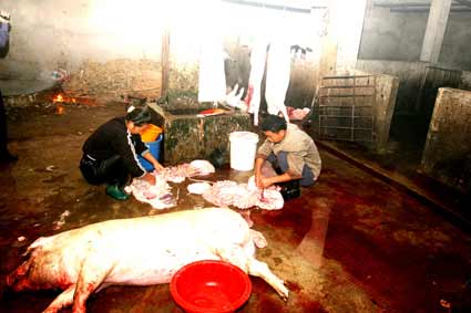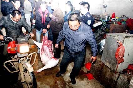 10月18日清晨5时许,淮南市商务行政执法大队、潘集区公安分局经侦大队、潘集区商务局三家联袂执法对潘集区高皇镇商务街西门一家非法屠宰场进行突查。结果发现,这家非法屠宰场为宰杀一条龙作业,然后将私宰肉品进行批发,使之流入市场,严重干扰国家规定的生猪定点屠宰政策。执法人员当场收缴4头毛猪。此案正在进一步审理中。