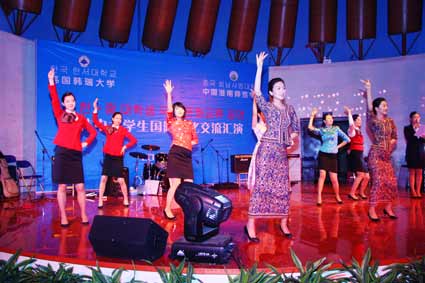 11月2日上午,在淮南师范学院音乐厅上演了一场别开生面的中韩大学生文化交流汇演。来自韩国韩瑞大学航空学院音乐表演系的几十位韩国美女学生为淮南师范学院师生表演了空乘安全知识场景剧及空乘制服展示。图为现场韩国“准空姐”们的才艺演出。
