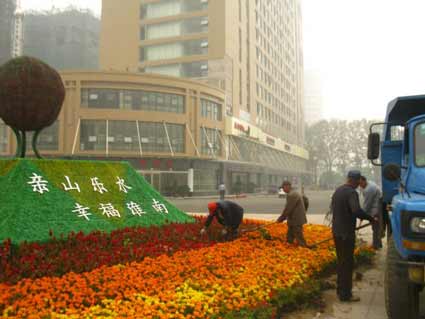 记者走访发现,这些不见了的花草原来是被负责园林绿化的工作人员清运走了。11月4日下午,记者在泉山十字路口发现,几名园林绿化工人正忙着清理已经开败了的花草。