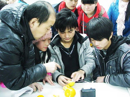 12月16日下午,淮南二十四中迎来了第三届科技节水果、蔬菜生物电池的制作与试验大赛。比赛现场,同学们三人一组,土豆、西红柿、甜橙等蔬菜水果被用作材料,制造出水果、蔬菜电池。大多作品接线准确,能制造出电流来。比赛最终以通电电流大、通电持续时间长为评分标准得出冠军。比赛现场轻松、有趣,欢笑声中又充满了团队协作精神。