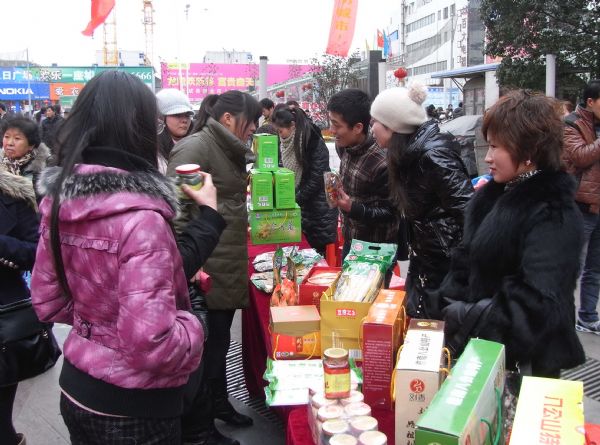 当日15点30分左右,伴随着浓郁地方特色的花鼓灯表演,展销会进入佳境。花鼓灯表演令人心驰神往,只见演员们手把扇子、手帕,伴随着人们熟悉的音乐翩翩起舞,引来众多市民的叫好之声。市民们在现场不光可以欣赏精彩的舞蹈,还可以品尝由展销会上提供的淮南美食,互动环节更是加深了大家对家乡特产的认识。这次展销会上淮南土特产云集,有焦岗湖的大雁、神仙豆、休闲豆干、夏集贡圆、各类食用菌、瓜子、炒货等。许多市民对这些产品都赞不绝口,并表现出了浓厚的兴趣。全国人大代表鲁中祝也带着自己企业的特产食用菌来参展了,她是第一次参加在市区举办的此类活动。鲁中祝显得很兴奋,她告诉记者,这样方式的活动非常好,以旅游推动商品,产品与老百姓零距离接触,让老百姓品尝到淮南特产的同时也可以进一步推动各个企业的发展,企业和市民都欢迎。鲁中祝说,去年旅游活动为他们企业带来的商品销售额达到60万元,她渴望淮南旅游业的进一步发展。住在惠利花园城的市民邢师傅当天是为采购年货而来到商贸广场的,他在各个展销点上都转了一遍,显得十分开心。他说,买点淮南土特产过年时招待客人,那是别有一番风味!