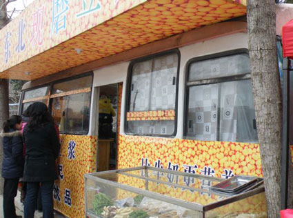 当天,记者来到淮南职业技术学院,在该校大门口不远处的路边有一家巴士小店。只见这个利用报废巴士汽车改成的豆浆店,整个汽车的外形除了4个轮子全部被卸走外,其他的特征都得以保留,看上去就像一辆真正的巴士。从车门进入后,记者看到整个车厢的顶棚和四壁基本保持完整,但是座椅已经被全部拆除,其中约三分之二的空间成了压榨豆浆的操作间,另外三分之一被改成了一个小卧室,简约而温馨。采访过程中,记者看到不时有顾客走近这辆报废的巴士车,站在车窗口,购买店主刚刚压榨好的豆浆,生意看上去相当不错。
