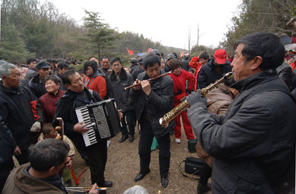 3月11日农历二月十九,大通上窑古庙会上锣鼓阵阵,鞭炮齐鸣,一百多家民间组织参与了表演,其中一处手风琴、笛子、二胡和单簧管演奏的小型“音乐会”,让来自四面八方村民大开了眼界。