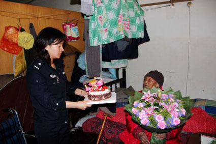 图为洞山派出所民警为百岁老人上门办理二代证的同时,还为其送上鲜花和生日蛋糕庆祝寿辰。