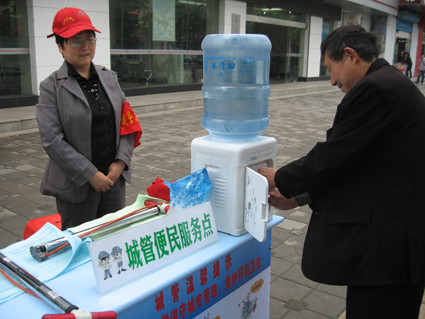 “很多市民夸赞服务点办得好,看到市民开心,我们的辛苦付出是值得的!”今年已61岁的郑传杰是一名城管志愿者。当天下午,他和另一位老人共同守在城管便民服务点旁边,为过往行人送上贴心的服务。