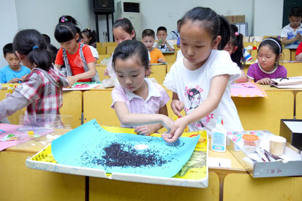 用旧衣服做成的京剧脸谱,用可乐瓶盖和包装泡沫做成的“大树”,一个个创意作品,伴随着孩子的美好心愿就这样应运而生了。22日下午,淮师附小洞山校区里,来自二年级的100多名孩子,组成45组参赛组,展开了一场别有生趣的“畅想贴画”比赛。比赛现场,孩子们2-3人一组,用事先准备好的环保材料,在规定的30分钟内完成一幅有意义的创意贴画作品。作品里包含水族馆、美丽家园那样的景物,也包含一些诸如“掩耳盗铃”的成语故事,孩子们用布拼出笑脸,用棉花做成白云……