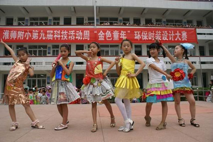 5月25日下午,一场“金色童年”环保时装设计大赛正在淮师附小三年级同学间举行。学生们用废弃的瓶盖、饮料盒和旧废报纸、布料、旧衣服、塑料袋、塑料绳子,挂历的纸片以及树叶等物品设计自制服装。孩子们充分发挥自己的聪明才智,尽情展示了自己的设计才华。他们的设计融入了“绿色环保”的设计理念和环保意识,展示了他们的动手能力、创新能力和艺术风采。