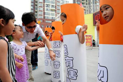 图为,5月31日,田五幼小朋友向家长宣传香烟对儿童的危害。