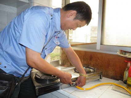 图:淮南中燃员工正在为居民家中的灶具更换不锈钢波纹软管。