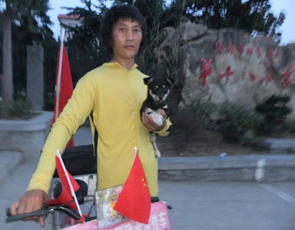 见到盛飞龙时,时间已是6月24日17时,人单影孤的盛飞龙,陪伴他身旁的只有那只路途中收留的小狗。“你的搭档‘阿贝哥’呢?还有与你们同行的‘阿贝哥’的母亲呢?”记者问到。“他母亲生病,中途回去了。”盛飞龙说。此时,周围一位旁观者告诉记者,他刚见过一位骑着三轮车宣传奥运的人,应该是他的那个同伴。盛飞龙立即拨通“阿贝哥”的电话,希望他能过来一起接受采访。“阿贝哥”说他已去蚌埠。电话里盛飞龙一直在解释他提出单行的原因是因为他的眼睛出问题了,怕耽误他们的行程。接着盛飞龙向记者解释说:“在合肥我从车上摔下来,被一位不留姓名的好心人送到医院的眼科救治。我从合肥骑车来到淮南用了2天的时间。”“那你还会坚持下去吗?你的终点站是哪?”记者问。“北京。到了北京,我们将会受邀去伦敦参加奥运会的武术表演。”这时,我注意到了这个貌似李小龙的盛飞龙目光坚定而执着,尽管他现在风餐露宿,尽管他带着伤痛、行程艰难。尽管前路漫漫,他形影孤单,可是,为了传承中华武术、为了宣传奥运精神,他一定会坚持下去。因为一路他遇到许多好心人的帮助,有了他们,再苦再难他也不退缩。