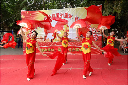6月26日下午,在庆祝建党91周年到来之际,在田家庵区洞山街道中兴社区市委小游园里,来自洞山街道社区居民、城管志愿者及学生精心编排的舞蹈、乐器联奏、歌曲等10多个文艺节目,为住在社区里的居民倾情表演。