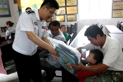 图:爱心人士向一名留守儿童赠送一个可爱的新书包。
