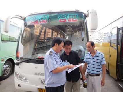 高温行车极易出现交通事故,为保证客运安全,7月9日,田家庵运管所驻站办工作人员对长途汽车站的过往车辆,逐一发放十滴水等物品,及时告诫司机师傅出车前对车辆的油路、电路、刹车系统、冷却系统等重要部位进行检查。图为工作人员为司机强调安全行车的重要性。