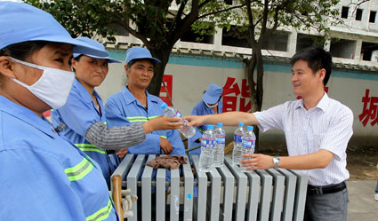 持续高温天气下,田家庵区800多名环卫工人坚守一线,为美化城市环境奉献汗水。田家庵区环卫处从6月底开始,每天上、下午为环卫工人送上矿泉水和西瓜,在为城市美容师送上一份清凉时,更送上一份关爱。