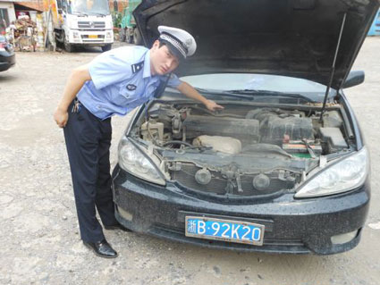 7月12日下午4时,田家庵二大队民警郑海鹏驾车在洞山西路巡逻时,发现前方一辆浙B92K20黑色丰田佳美轿车号牌颜色不正宗。车被拦停后,民警观察到该车没粘贴年审标志,驾驶人拿出的假行驶证也被民警一眼看穿。经仔细检查和公安网信息平台比对,该车系套牌,且车型和被套用车辆的车型一模一样,明显属于克隆车。