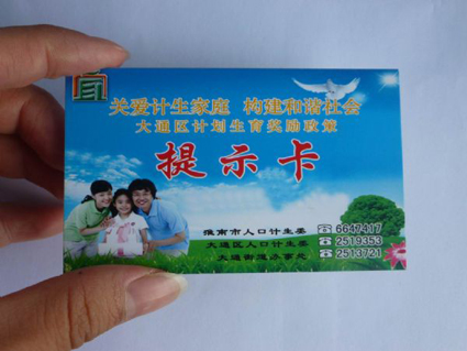 计划生育奖励是国家给予计划生育家庭的一项奖励政策,尤其在农村,计划生育奖励政策的普及尤为重要。大通区计生委为了让区内群众更加了解计划生育奖励政策和领取时间及办法,特别制作了“关爱计生家庭 构建和谐社会 大通区计划生育奖励政策提示卡”(如图),提示卡正面印有市、区计生委的电话号码,背面则印着政策法规及奖励领取时间、地点等。据了解,目前该提示卡已发放到户,计生家庭可按提示卡上的时间领取奖励。