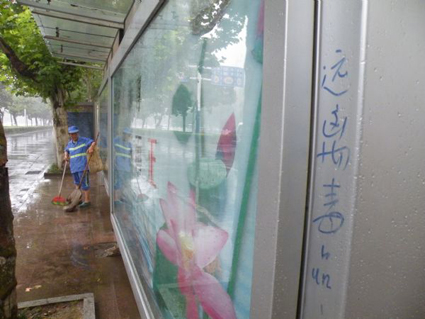 “这人也是好意,但字写在这里怎么看着怎么觉着别扭。”8月13日,在洞山中路铁路新村附近的一处公交站台前,市民朱先生指着站台立柱上被人涂鸦的四个蓝色大字——“远离毒品”,向记者反映说。稍后,记者走访了多处公交站台,发现一些站台上多多少少都有被人涂鸦的印记,已经影响了市容美观。采访过程中,不少市民纷纷表示:“公交站台是公共设施,个人无论出于何种目的,都不应该在这上面乱涂乱画。”图为市民把“远离毒品”4个字写在公交站台立柱上。