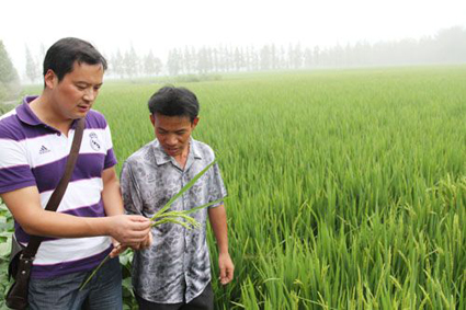 8月13日,凤台县农机技术专家米占喜(左)在刘集乡高潮社区指导农民加强水稻田间管理(如图)。目前,凤台县机插秧相继进入孕穗和抽穗关键期,县农机技术专家深入田间地头手把手地指导农民防治水稻病虫害,确保水稻正常生长。(通讯员 常开胜 记者 张昌涛摄影报道)