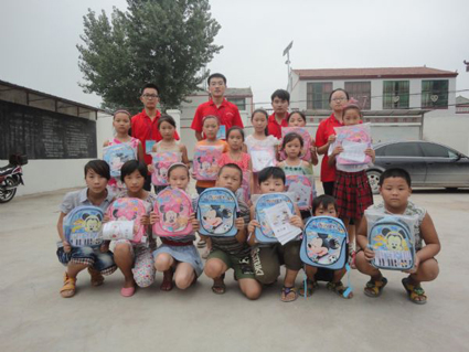 图:领到新书包的留守儿童和大学生志愿者们在一起。