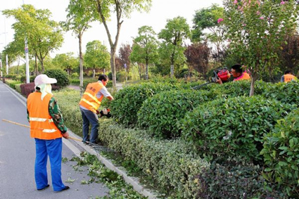 为迎接参加中国豆腐文化节的八方宾客,8月24日下午,一群身穿东华集团工作服的工作人员正对山南新区淮河大道路段两旁的园林进行修剪。