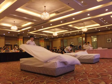 看谁三分钟内将床单铺好、被子叠整齐、枕头摆好;看谁回答的英语准确又流利;看谁中餐宴会摆台又快又到位。8月31日,第二届淮南市旅游星级饭店服务技能大赛在金满楼大酒店展开。全市17个星级以上酒店宾馆代表队的33名选手参加了比拼。