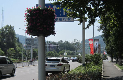 一簇簇矮牵牛被悬置在路灯灯杆上,成为城区路边一道美丽的街景。9月5日,记者沿着淮河大道向洞山隧道走去,在道路边上看到,每隔数米远便有许多粉红色的矮牵牛簇拥在路灯灯杆上(如图),在阳光照耀下,鲜艳夺目。在靠近洞山隧道北侧的一段人行道旁,还放置了一排整齐的孔雀草。印有“淮南豆腐 香飘世界”的彩旗迎风飘动,凸显节日的喜庆。“悬空”的矮牵牛、地面的孔雀草与道旁的绿树一起,构成了一幅美丽的立体风景画,吸引过往行人驻足观赏、拍照。
