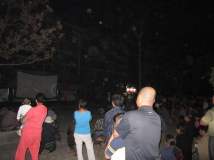 当晚6点多钟,天色渐黑。在大通街道居北社区活动广场,银幕高挂,放映机架起,居民早早聚在一起等待电影开始放映。当晚为居民放映了防火及安全用电常识等科教片。以及《5·12汶川不相信眼泪》等故事片。54岁的王洪宝看到电影,乐呵呵地说:“通过放电影学一些科学知识,很不错。”