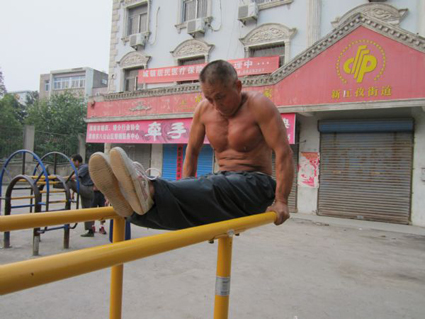 当天下午4点半左右,在八公山脚下的一个居民健身的地方,记者被一位大叔所吸引,只见这位大叔先是撑住双杠做了几十个臂屈伸,轻轻喘了口气后,紧接着手撑双杠来了个直角支撑,持续时间一分钟以上。从双杠跳下后,稍作休息,他又做了几十个俯卧撑,然后是全身活动,看样子十分轻松。整个过程不到10分钟,大叔展示了令人赞叹的力量。当然,最吸引人的还是他那一身发达的肌肉,着实让人羡慕。