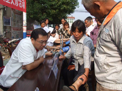 图为义诊活动现场,医生正给村民进行病患诊治。