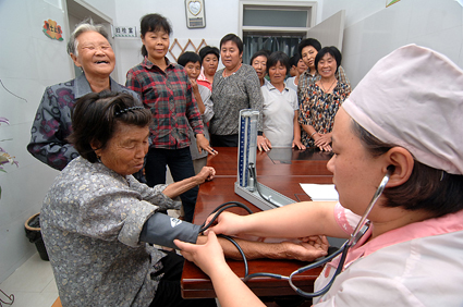 两节临近,为解除远在外地务工子女的后顾之忧,大通区洛河镇全面实施“宜家工程”行动,对9个行政村8个社区近4000多位留守空巢老人进行免费体检。图为9月26日下午设在镇计划生育服务站体检室里正为老人们体检时的场景。
