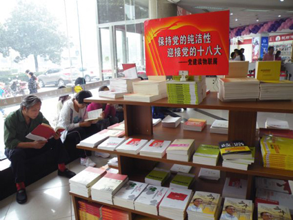 十八大召开前夕,淮南书城上架多种党建读物,举办“保持党的纯洁性、迎接党的十八大,党建读物联展”活动。10月10日,记者在淮南书城内看到,这些书籍中既有偏重理论的《基层党组织建设》、《回顾辉煌历程喜迎党的十八大》、《保持党的纯洁性》等书籍,又有《干部科学减压》、《歧路》、《三牛风波》等通俗读物,吸引众多读者驻足翻阅。