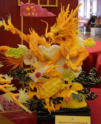 图二:获大赛特金奖的果雕作品《中华国威》。
