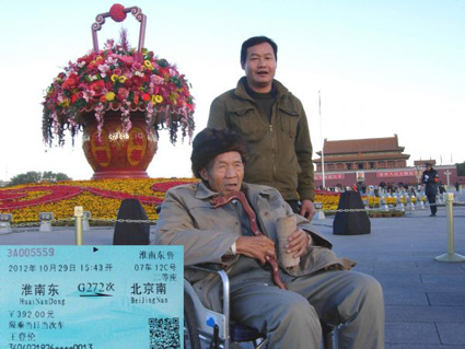 图二:王登伦老人在北京天安门前(注:王登伦坐轮椅是为出行方便而非身体残疾)。