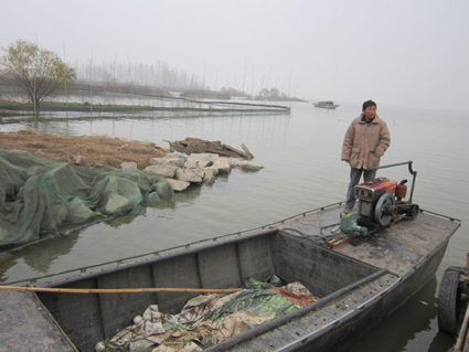 在高塘湖中,一道围网将水面分开,一侧属于凤阳县管辖,另一侧属于淮南市管辖。王宗义指着水中的围网告诉记者,当时有3个人就拉着这些围网才坚持等到救援。记者顺着王宗义手指的方向看到,在离围网约50米远的地方,就是沉船位置,一个把手高高地翘在水面上,船身已淹没在水中。26日上午10点58分,在众人的努力下,最后一具尸体终被找到。