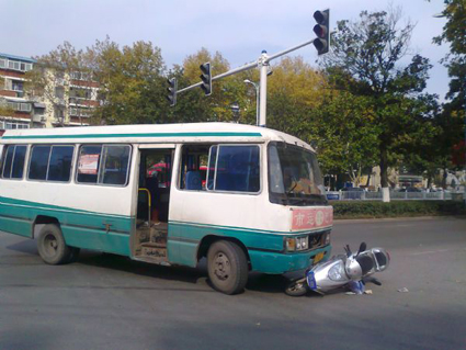 11月15日12:30左右,在洞山中路老龙眼丁字路口,记者目睹一辆过马路的电动车与一辆直行的中巴车相撞,骑电动车的老人头部受伤,血流不止,躺在路面上。据事故现场目击者介绍,过马路时,正亮着红灯。