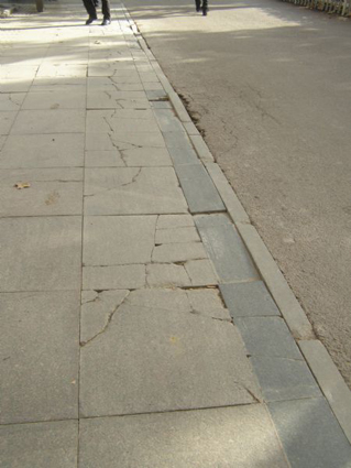 图四:机动车道经常驶入或停放人行道,洞山中路的人行道板已经被车辆碾压得支离破碎。