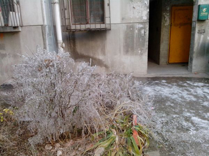 连日来,淮南夜间最低气温均在零度以下,市民们感受到了滴水成冰的严寒天气。图为12月25日早上,龙泉小区一住户家中太阳能夜间漏水后,水喷洒在绿化带上的树木中,令树木变成了“冰树”。